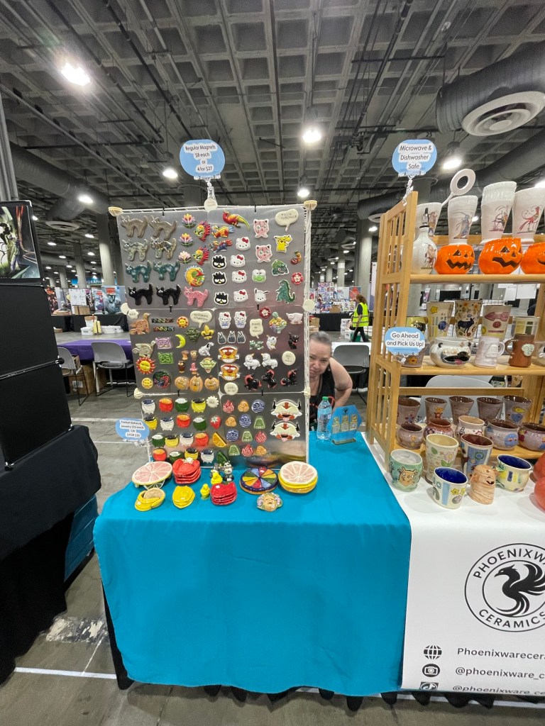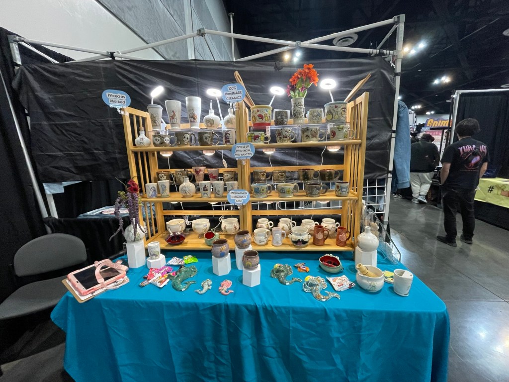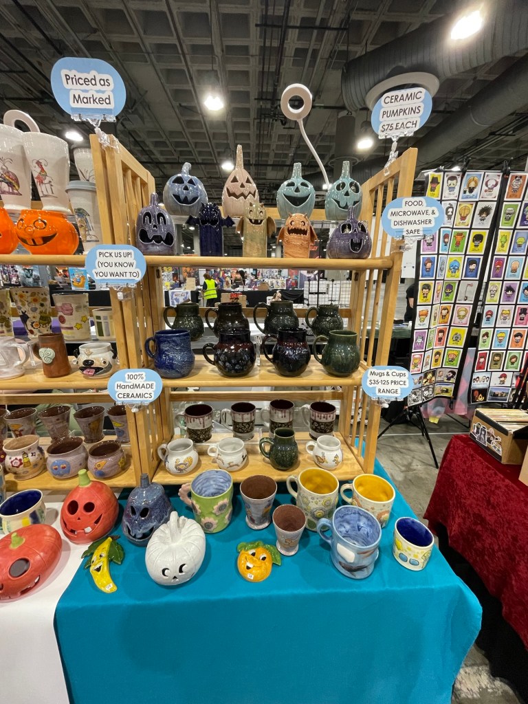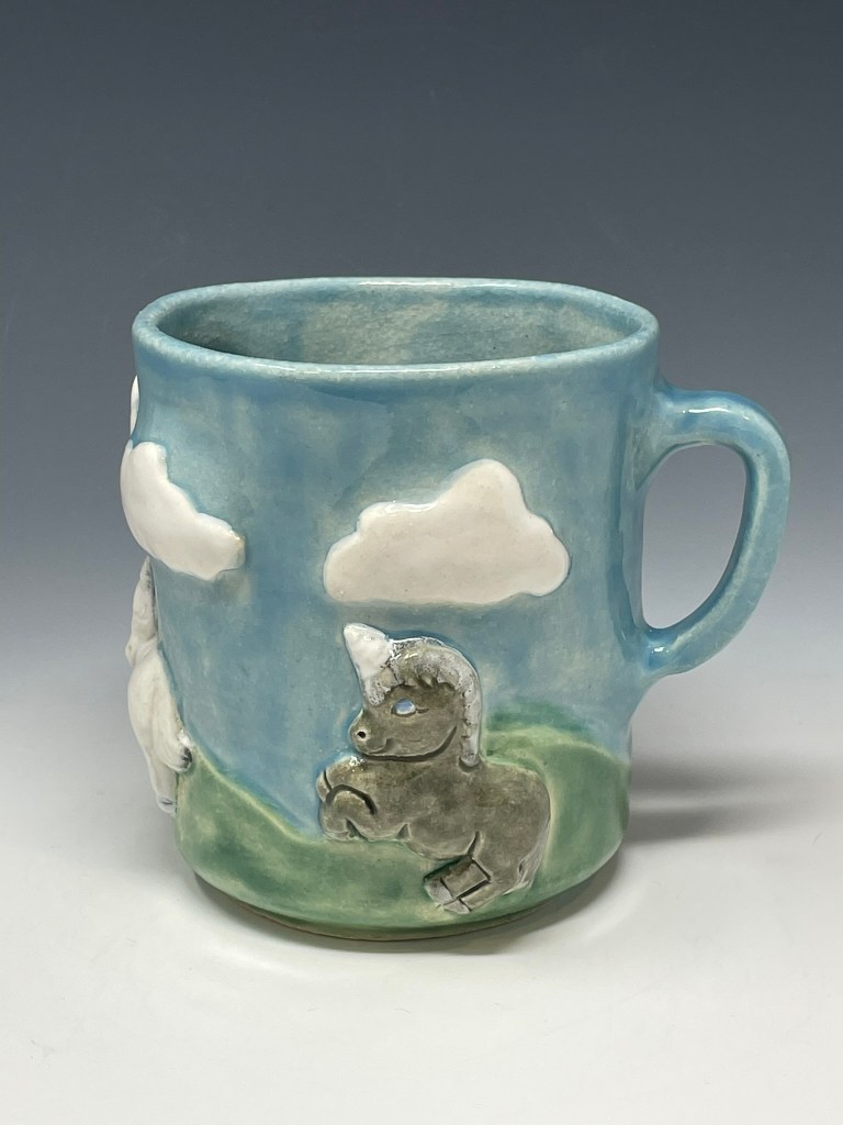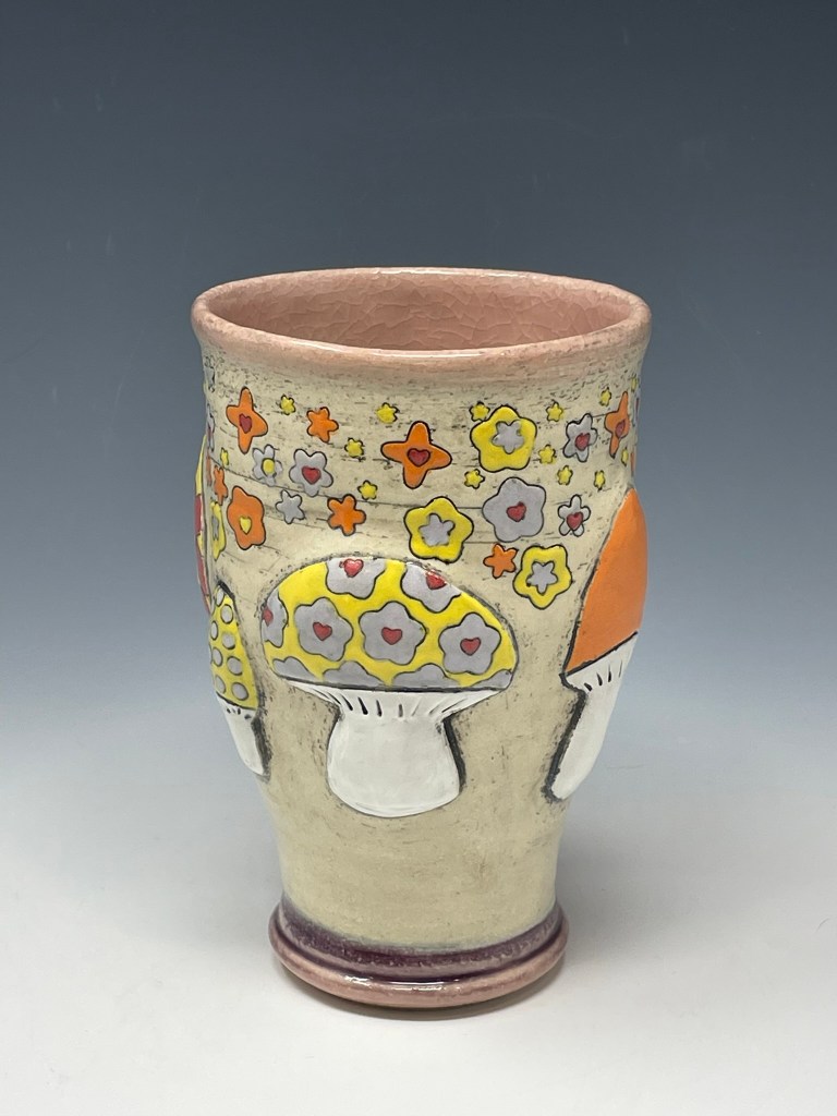 Mercy Neumark’s work blends the bold linework and vivid color of historical art—from medieval marginalia and vintage Max Fleischer cartoons to Mid-Century design—with the dynamic energy of new school animation and Japanese manga. Her ceramics balance whimsy and critique, pairing playful imagery with reflections on sociopolitical themes to create pieces that are both functional and expressive. Since 1998, she has explored and reimagined historical ceramics while crafting her own brand of whimsical, narrative pottery.