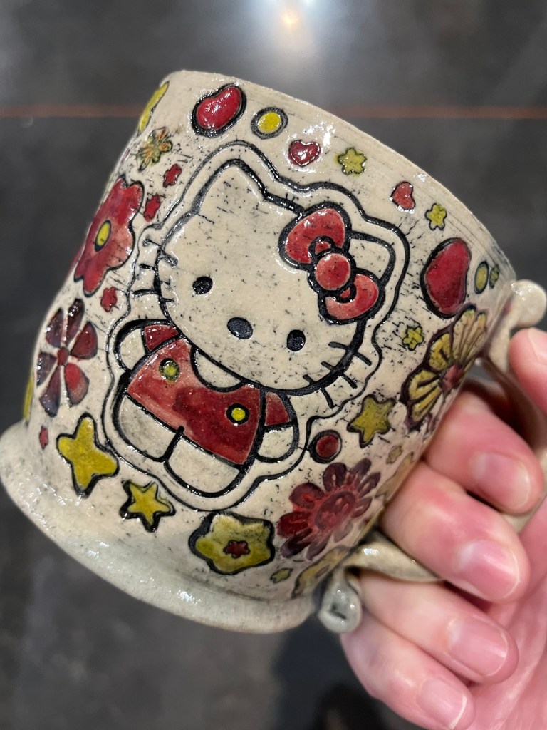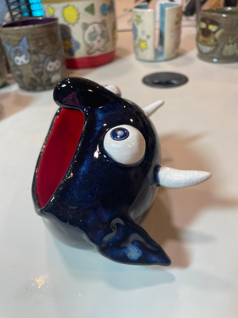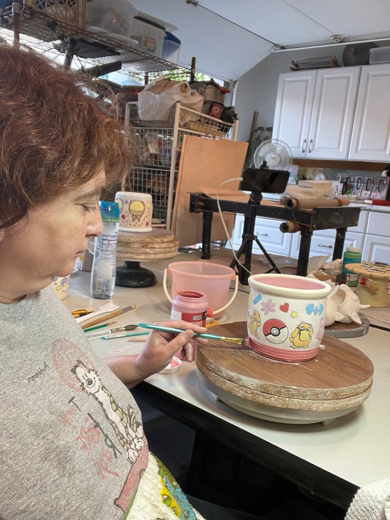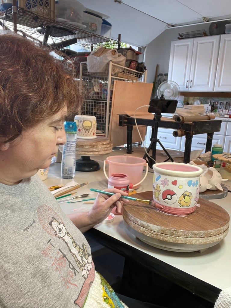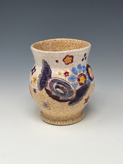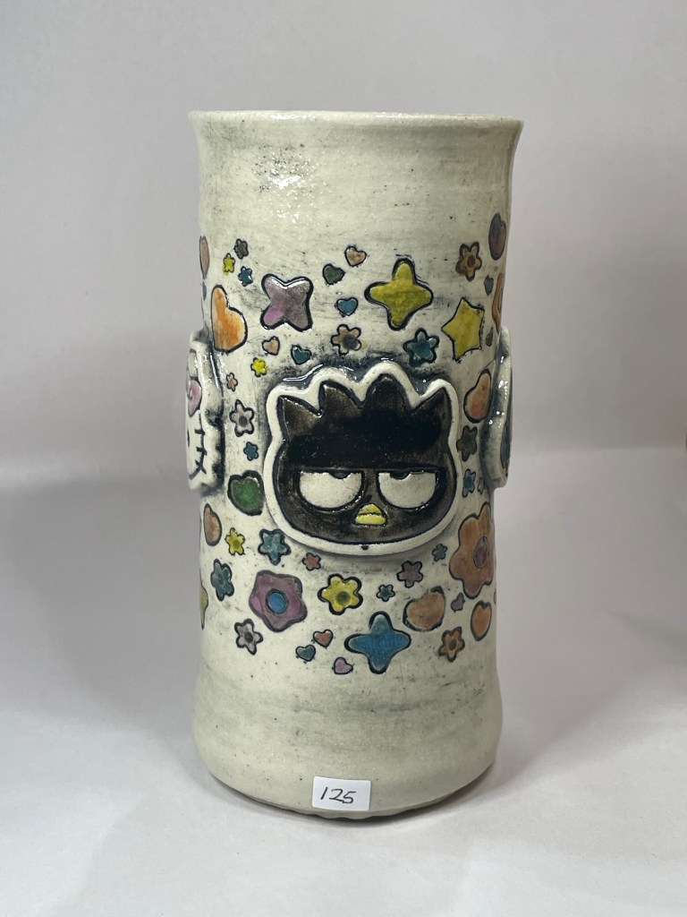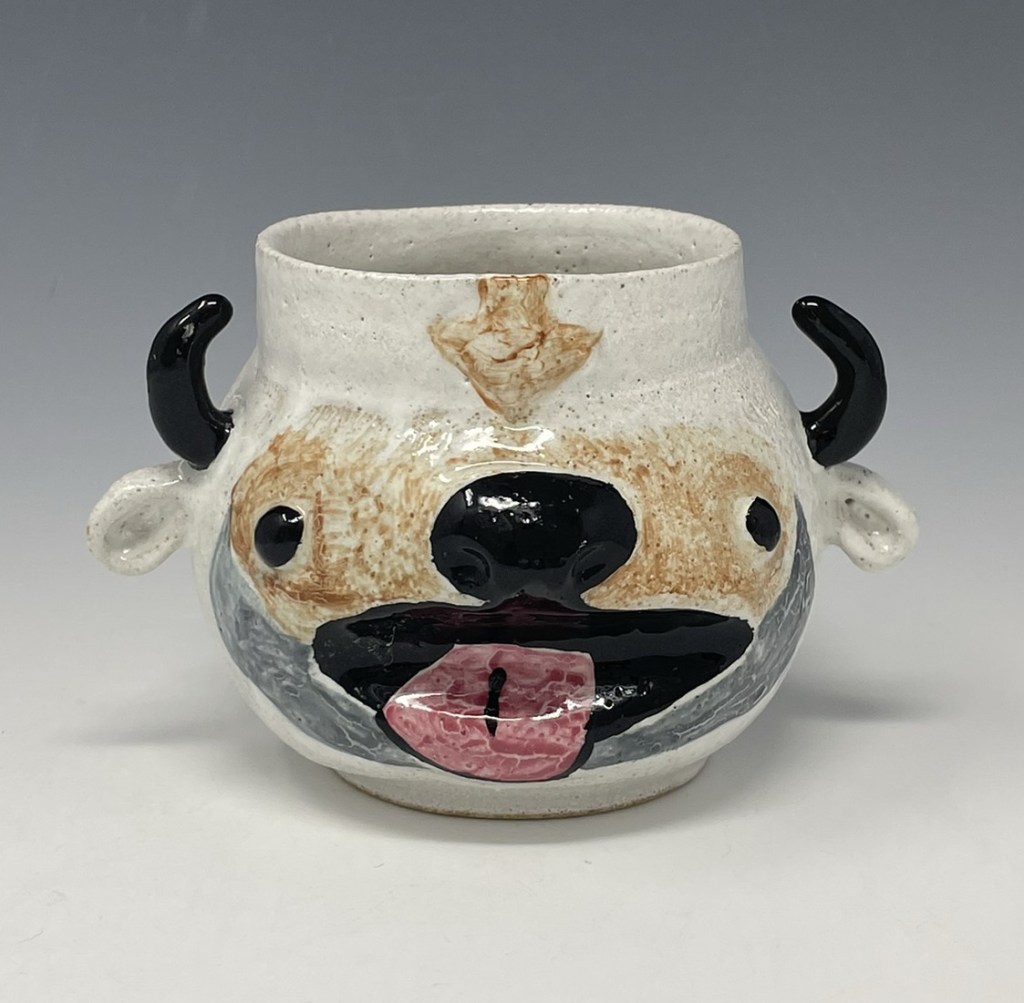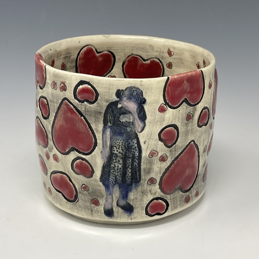 In more recent years, her focus has shifted toward contemporary forms, experimenting with sgraffito, decals, china paints, and underglaze painting. In 2022, she joined Lisa Orr as part of her Clay Cohort, further expanding her practice. Today, Mercy’s work blends whimsical design with sharp political satire, drawing inspiration from both current events and her cultural heritage.