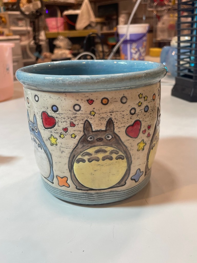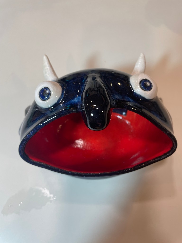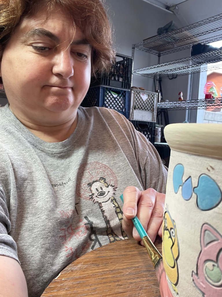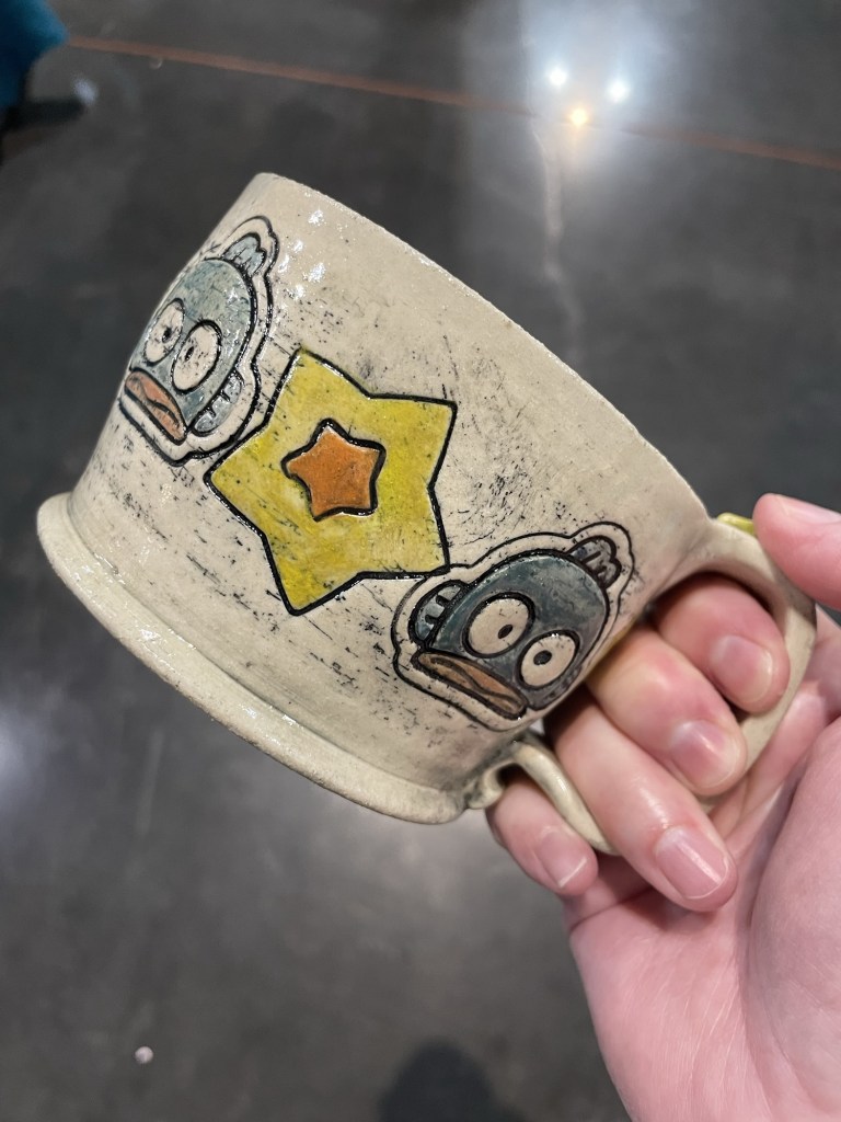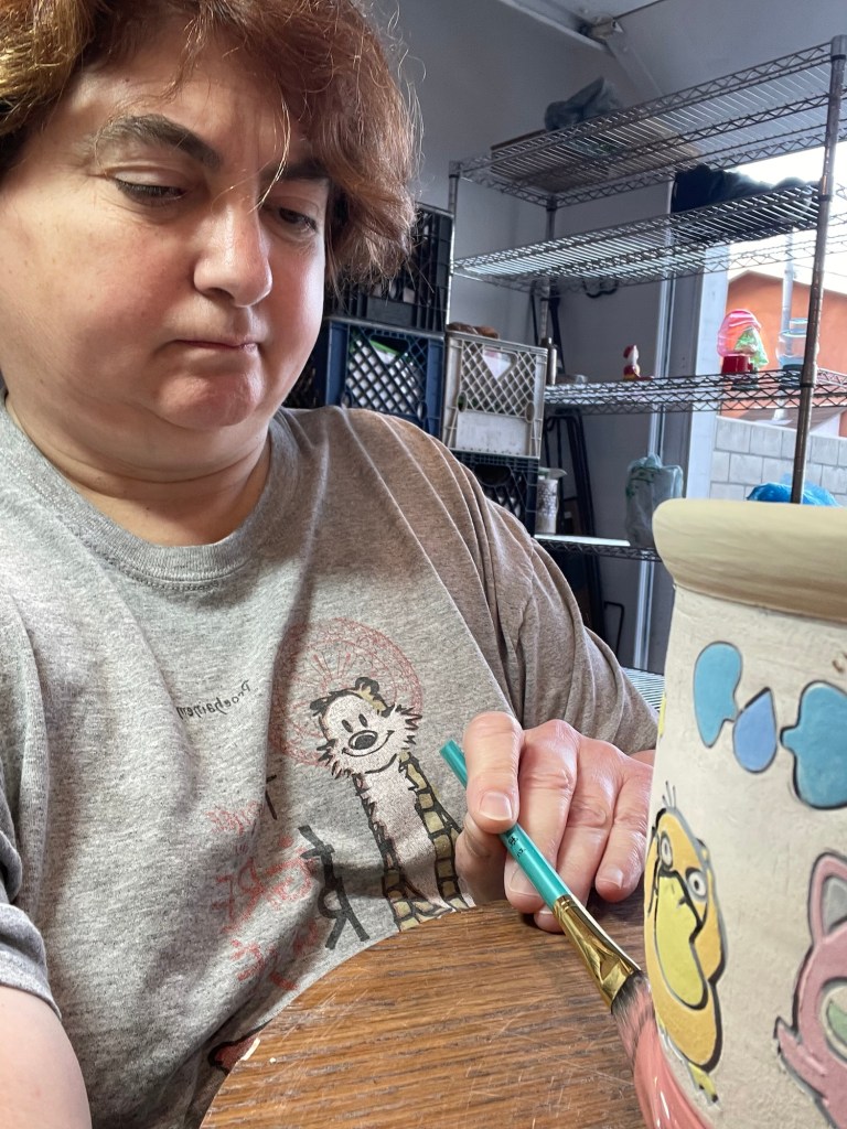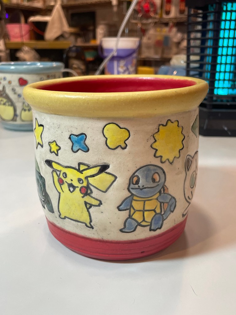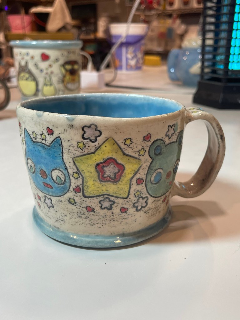 In more recent years, her focus has shifted toward contemporary forms, experimenting with sgraffito, decals, china paints, and underglaze painting. In 2022, she joined Lisa Orr as part of her Clay Cohort, further expanding her practice. Today, Mercy’s work blends whimsical design with sharp political satire, drawing inspiration from both current events and her cultural heritage.
